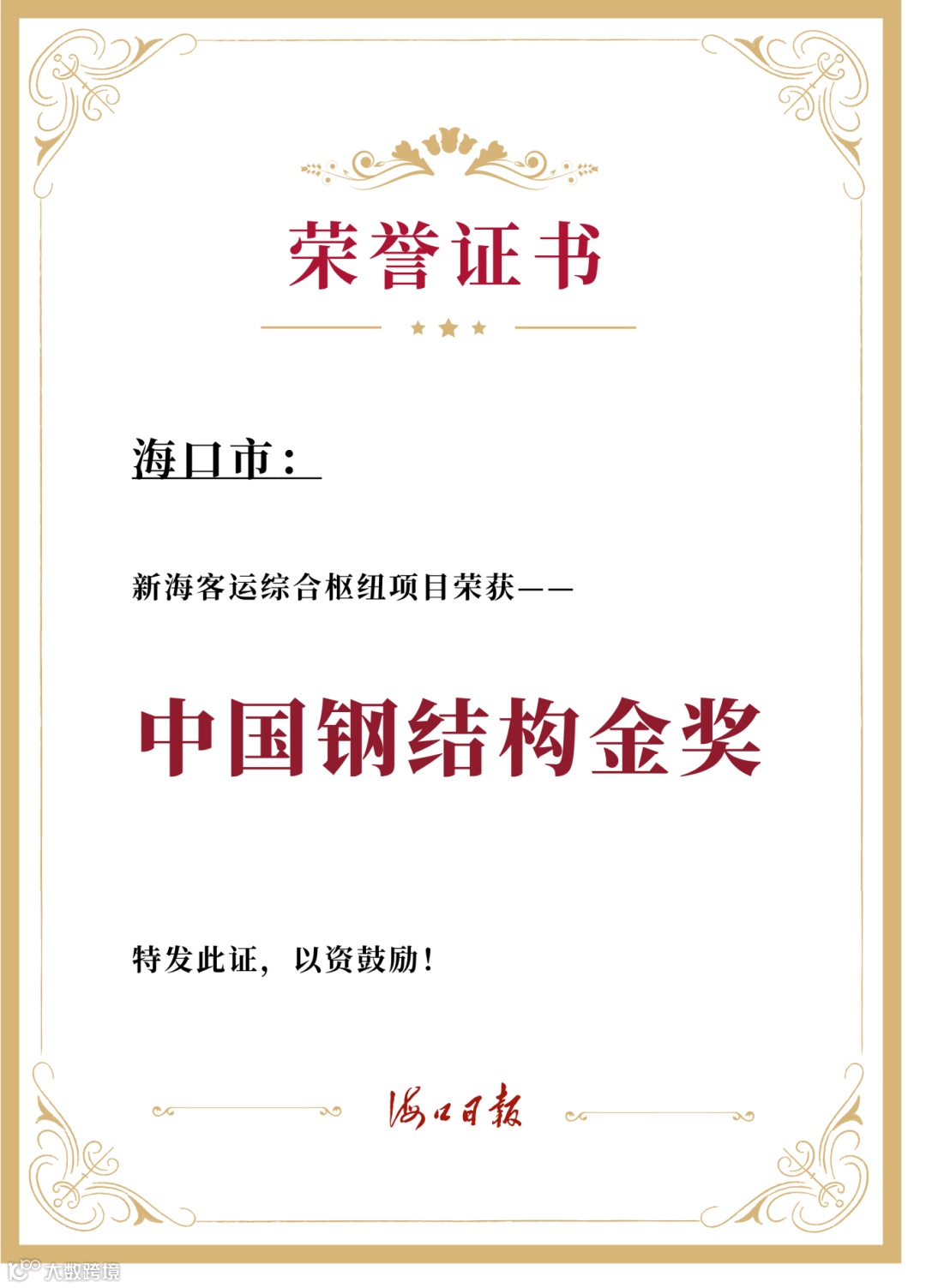 5月份,中国建筑金属结构协会揭晓了第十六届“中国钢结构金奖”(第一批)的获奖名单,海口新海滚装码头客运综合枢纽站工程项目脱颖而出,荣获钢结构行业的国家级最高荣誉——“中国钢结构金奖”。