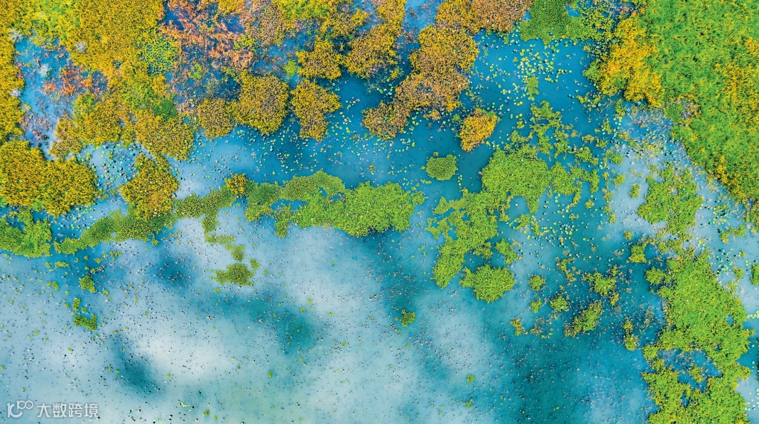 ▲海口市新坡镇潭丰洋湿地公园一隅,水生植物五彩缤纷,清澈的水面映照着蓝天白云,形成一幅令人沉醉的湿地秋日美景。康登淋 摄