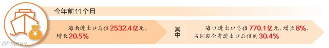 今年前11个月,海南货物贸易进出口总值2532.4亿元,比去年同期(下同)增长20.5%。其中,海口进出口770.1亿元,增长8%,占同期全省进出口总值的(下同)30.4%。