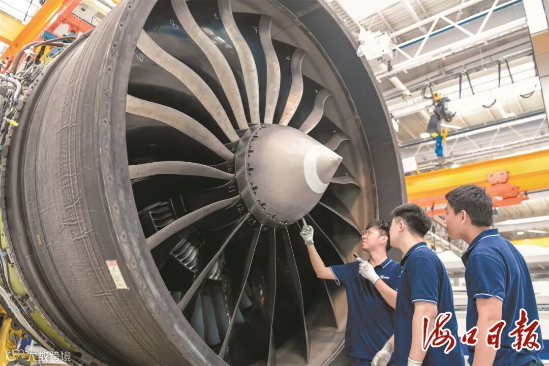 位于海口空港综合保税区的航空发动机维修基地依托“自贸港海关特殊监管区域”的叠加政策优势,提升了其在全球发动机维修市场的竞争力。图为技术人员在检修航空发动机。海口市融媒体中心记者 苏弼坤 摄