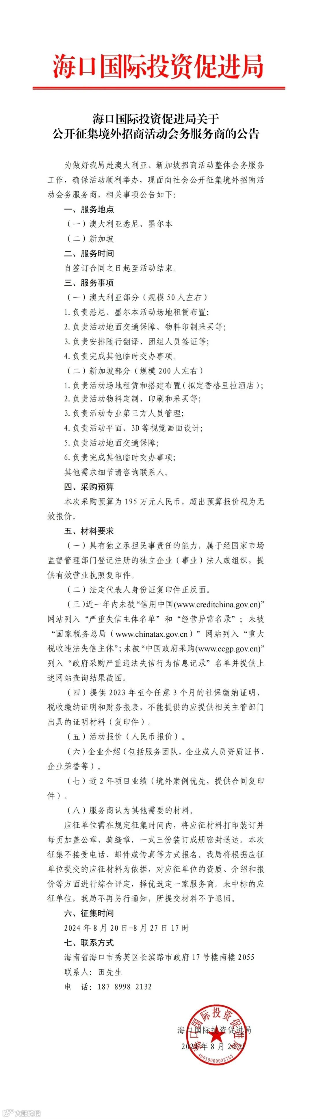 海口国际投资促进局关于公开征集境外招商活动会务服务商的公告