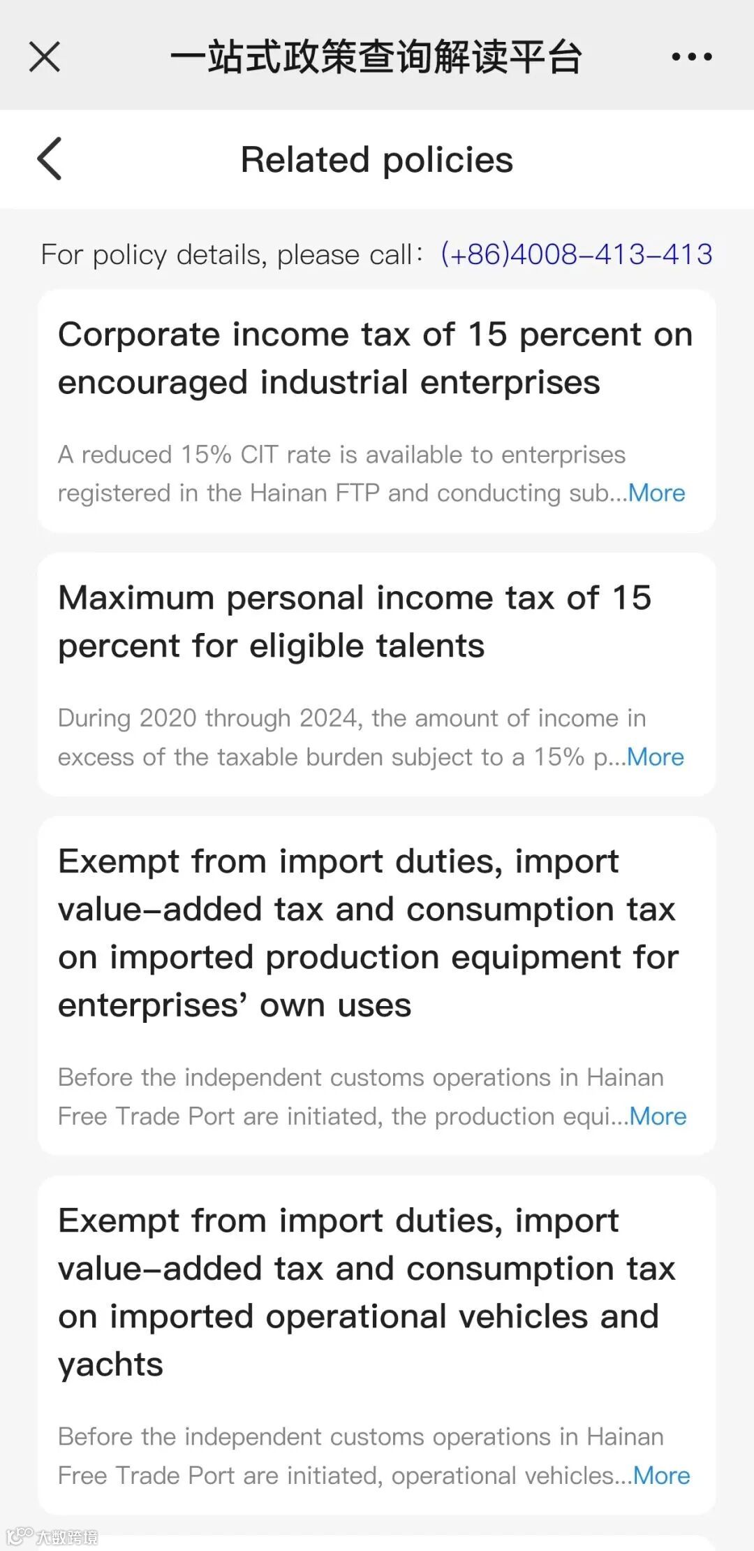 据介绍,目前平台英文版汇集了财税、贸易、投资、运输、人才等多方面海南自贸港重点政策信息,提供政策原文、核心内容、配套文件、使用条件、使用流程、政策解读、应用案例等内容,方便企业和个人用户更好地了解并应用海南自贸港政策。