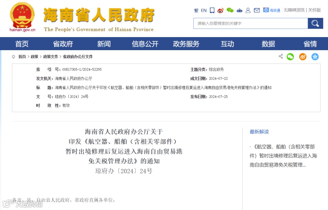 7月24日,海南省政府印发了《航空器、船舶(含相关零部件)暂时出境修理后复运进入海南自由贸易港免关税管理办法》(以下简称《办法》),自公布之日起施行。