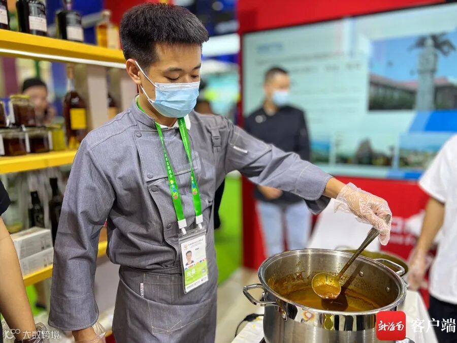 今年首次参展,徐文婧带来了海南工厂2月份首批生产的夜来香咖喱酱、南洋鸡饭辣椒酱、海南黄灯笼辣椒酱,备受消费者喜欢。在展区,每当有参观者前来,工作人员从冒着热气的锅里,用纸杯盛出一份咖喱酱,再放入几块面包片,蘸着咖喱酱吃,参观者品尝后纷纷点赞。