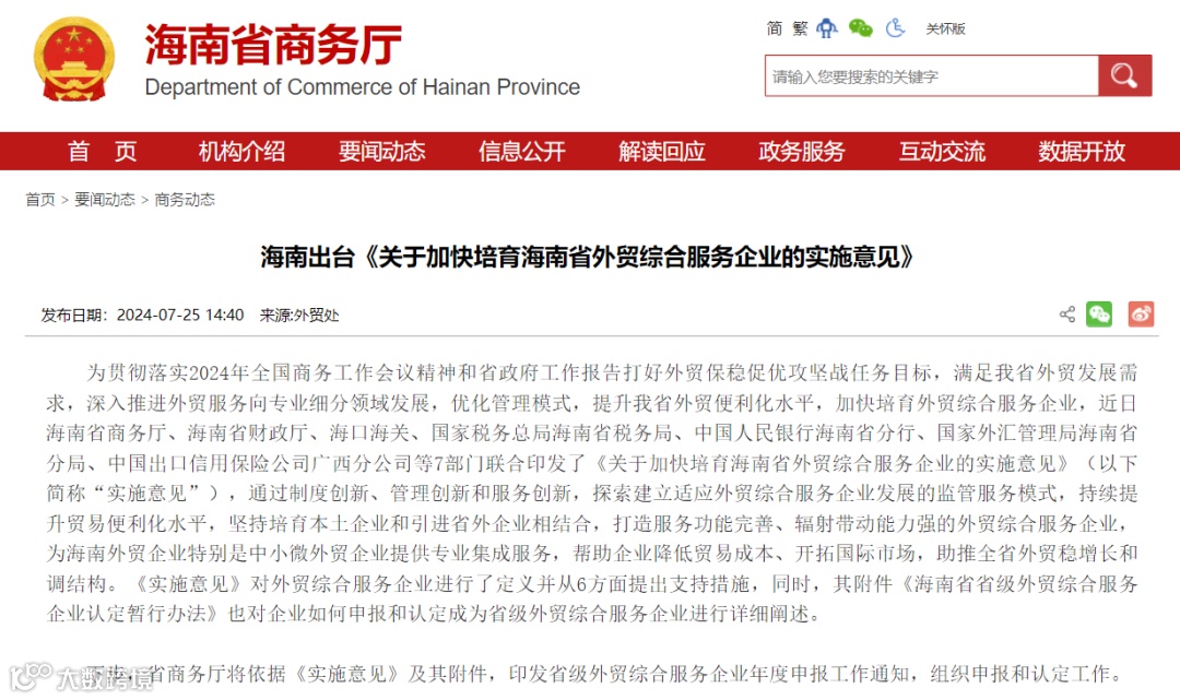 近日,省商务厅等7部门联合印发《关于加快培育海南省外贸综合服务企业的实施意见》(以下简称《实施意见》),明确通过6大方面支持措施,加快培育外贸综合服务企业。
