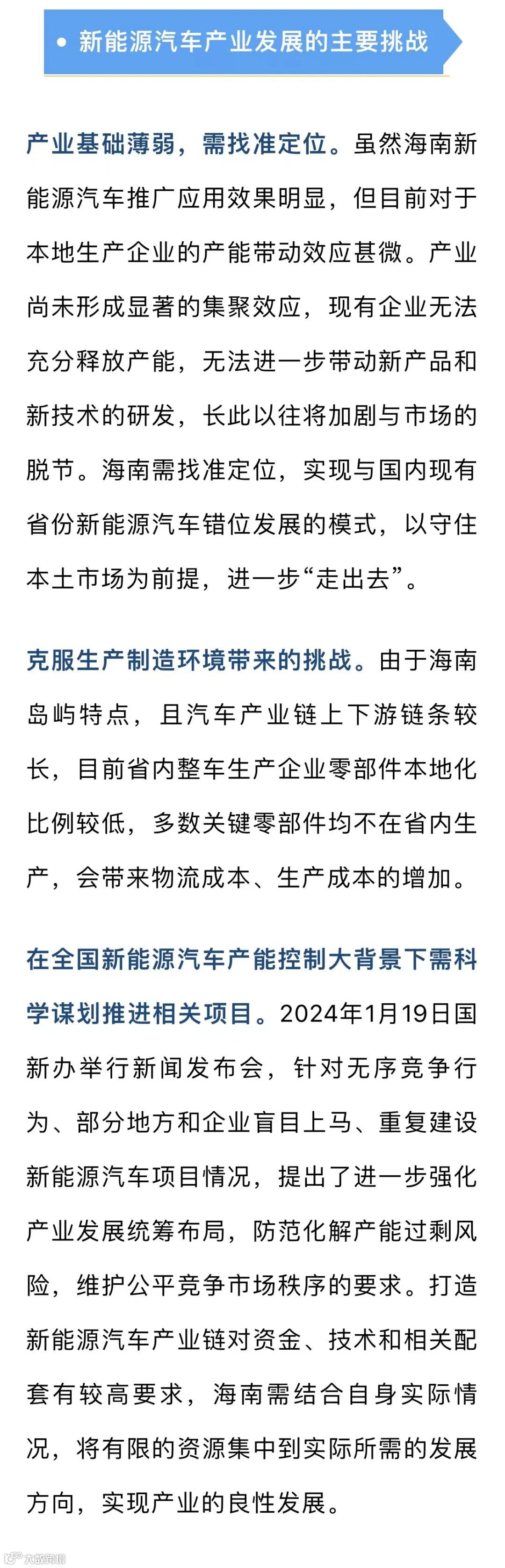 自贸港核心政策进一步精准赋能新能源产业发展。一是海南鼓励类产业目录修订后更具备可落地性。2024年2月23日,国家发展改革委、财政部、国家税务总局印发《海南自由贸易港鼓励类产业目录(2024年本)》,是针对《海南自由贸易港鼓励类产业目录(2020年版本)》修订。与2020年版本鼓励类目录相比,此次修订征求意见稿将“新能源汽车制造(按照《汽车产业投资管理规定》等执行)”修改为“新能源专用汽车制造(《产业结构调整指导目录》限制类、淘汰类项目除外)”,同时新增“通用设备(新能源生产专用车辆)制造”“非公路休闲车及零配件制造(新能源)”等鼓励类产业条目。2025年前,只有在国家及海南鼓励类产业目录内的业态才能享受企业所得税优惠和加工增值免关税等优惠政策。无论是新落地整车乘用车或者商用车项目,抑或采用CKD(全散件组装)或者SKD(半散件组装)模式,采用加工增值模式销往内地都绕不开整车生产资质的申请。2019年1月10日正式实施的《汽车产业投资管理规定》实际上对于希望获得新能源汽车生产资质的企业提出了更高的要求,审批变得更加严格,尤其在电动车方面,增加了对投资项目所在地限制的门槛。今年的调整改为鼓励专用车、特种车等产业发展,更加符合海南实际。利用好全岛封关运作前的窗口期将有助于进一步培育自贸港特色的新能源汽车产业链。二是加工增值免关税适用地由洋浦保税港区扩展到区外以及省内其他重点园区,为新能源汽车产业链发展提供了更大空间。新能源汽车产业链涉及生产制造环节需要一定的占地面积,随着在洋浦保税区外开展加工增值免关税压力测试条件不断成熟(如在海口,加工增值免关税政策已应用扩展到宝石加工等5个领域),加之鼓励类目录调整的精准赋能,推动新能源汽车产业链加工增值首单落地成为可能。