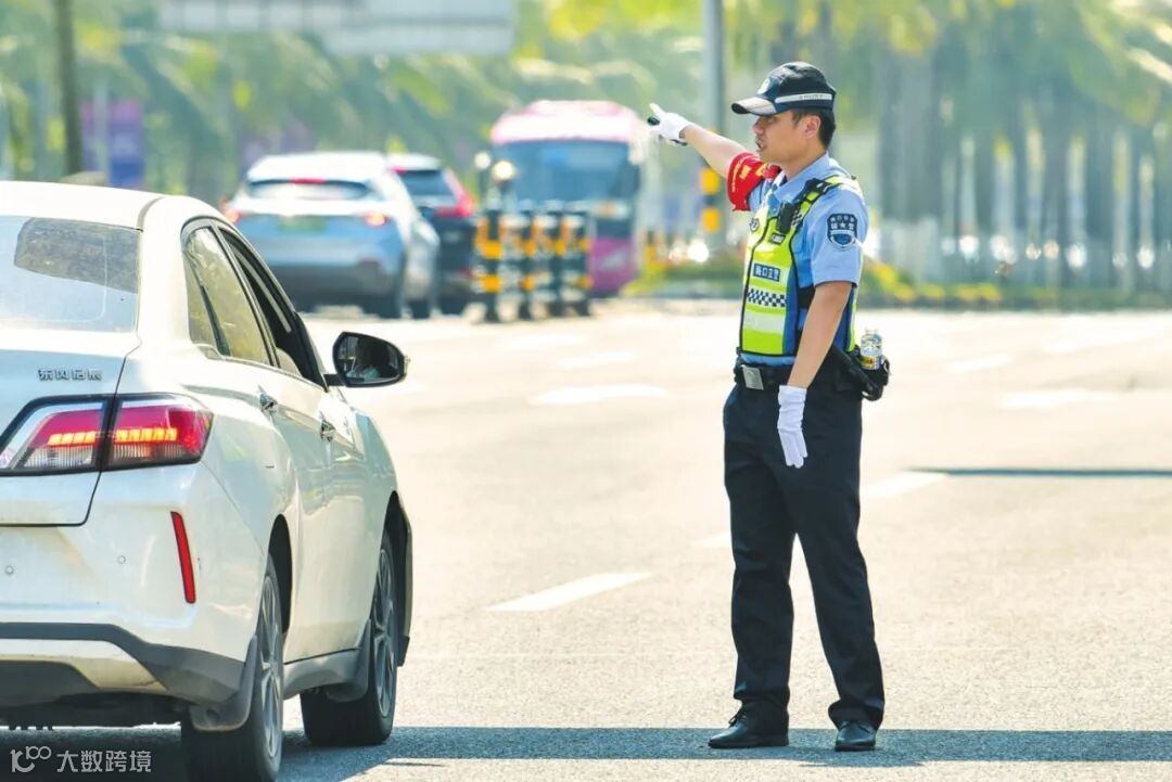 在第四届消博会期间,执勤交警在会展中心周边指挥交通,保障道路顺畅。