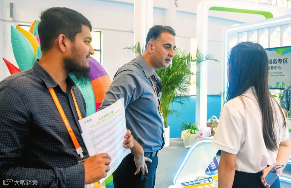 在本届消博会“活力新秀英数字复兴城”展馆,来自巴基斯坦的参展客商正在了解企业注册相关信息。