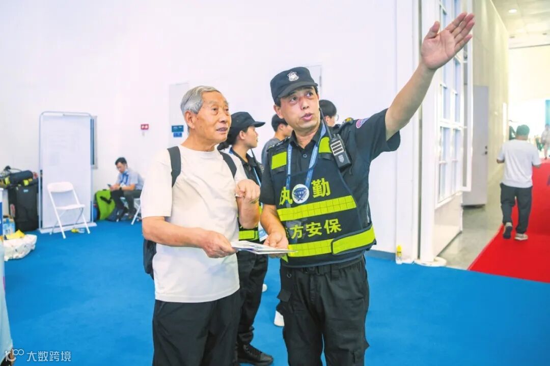 在本届消博会期间,为让参会人员有更好的体验,安保人员现场为有需要的观众提供服务。