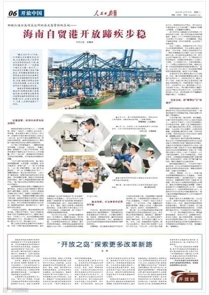 12月19日,《人民日报》海外版第06版刊发文章《积极打造全岛封关运作的海关监管特殊区域——海南自贸港开放蹄疾步稳》,关注海南自贸港建设最新进展等,版面图及全文如下: