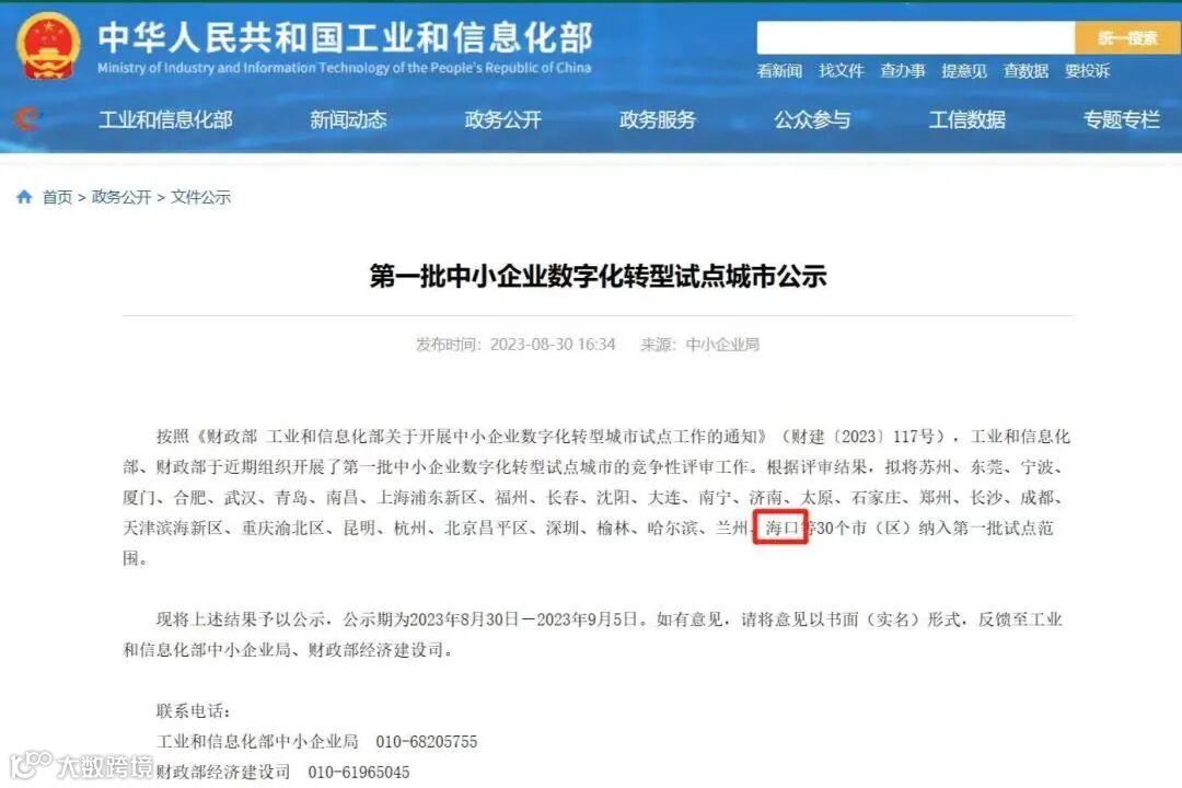 工业和信息化部中小企业局、财政部经济建设司近日联合发文公示第一批中小企业数字化转型试点城市名单,我省海口市入选。
