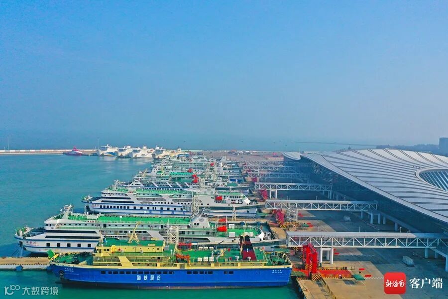 海口新海滚装码头客运综合枢纽站内,一艘艘船舶停靠在栈桥旁。新海南客户端记者 汪承贤 摄