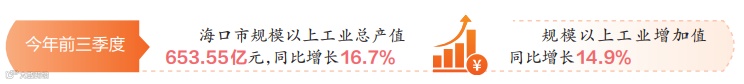 新技术、新产品、新赛道,带来的是海口工业的快速崛起。海口市统计局近日发布的数据显示,前三季度海口规模以上工业总产值653.55亿元,同比增长16.7%;规模以上工业增加值同比增长14.9%。其中,酒、饮料和精制茶制造业产值增长90.1%,汽车制造业产值增长74.2%,医药制造业产值增长14.5%,电气机械和器材制造业产值增长19.6%,先进制造业正成为拉动海口工业发展的强大引力。