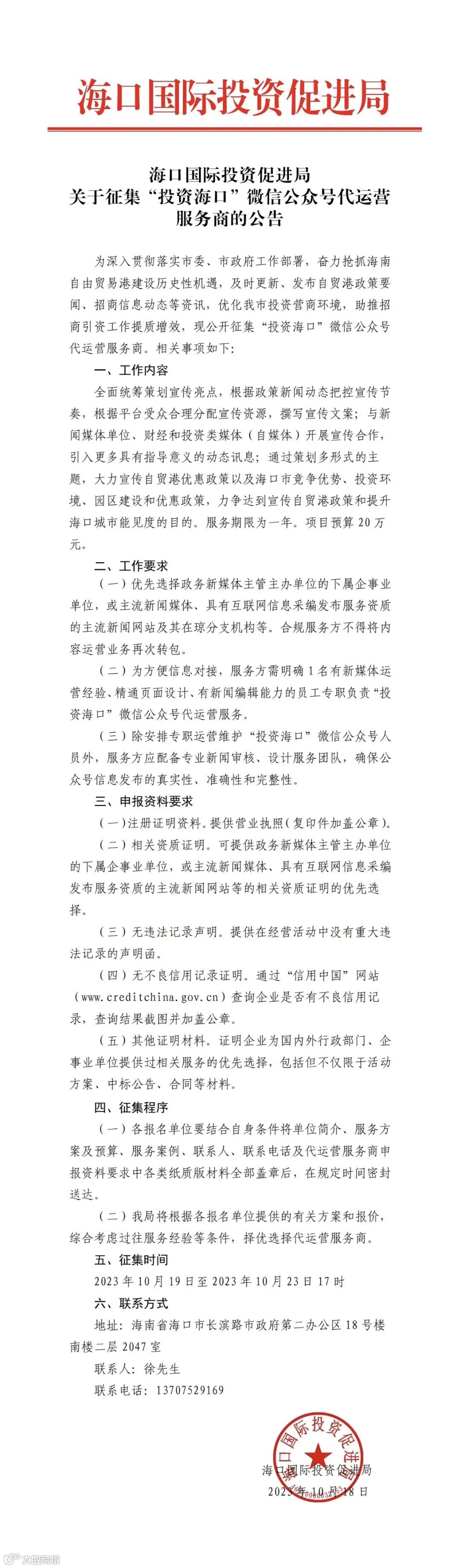 海口国际投资促进局关于征集“投资海口”微信公众号代运营服务商的公告