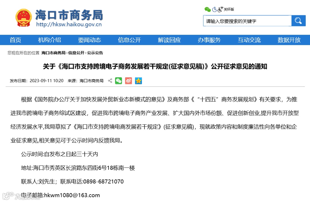 据悉,《征求意见稿》的公示期为9月11日—10月11日,相关企业及社会公众如有意见建议可通过电话及电子邮件与海口市商务局进行联系,联系电话:0898-68721070;电子邮箱: