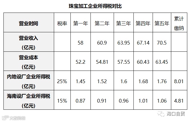 以国内某知名珠宝企业在海南省设立珠宝区域分公司,并基于目前内地生产基地实际运营情况进行对比分析。根据调研,目前内地生产企业主要从珠宝原料加工及首饰成品销售业务,年进口珠宝原料(钻石)约0.1吨,拥有四条生产线,总价约600万元,以从澳大利亚进口钻石,经营期1年为例进行比较: