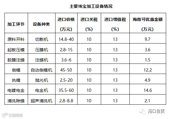 基于对目前我国主要珠宝加工制造设备进口价格的调研,结合对海南自由贸易港零关税政策下进口设备关税减免的综合评估可知,珠宝原料加工企业采购单套加工设备可实现约48.6万元成本降低,具有明显的经济性优势。