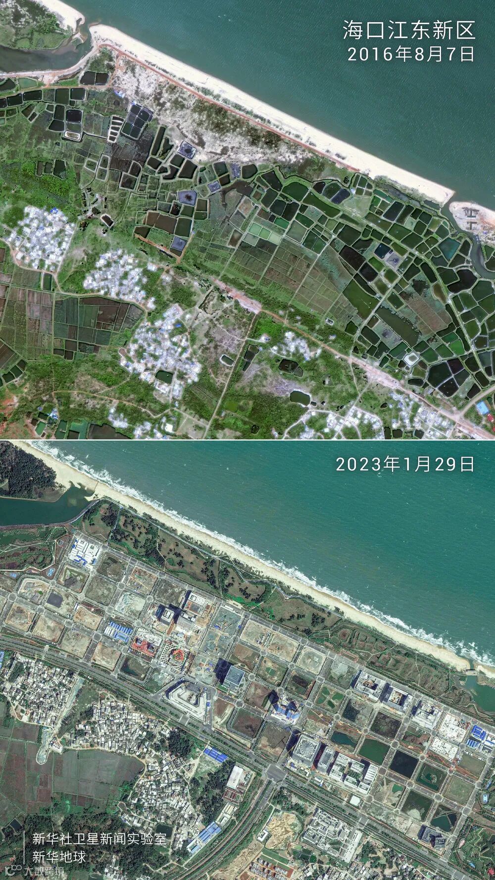 在海口市东部海岸,卫星发现,曾经鱼塘、荒滩遍布的地方变身为马路纵横、高楼林立的海口江东新区。“从零起步”,海口江东新区依托海岸资源丰富和地处海南航空枢纽等优势,重点发展总部经济和临空经济,努力打造“海南自由贸易港集中展示区”和“现代服务业示范区”。