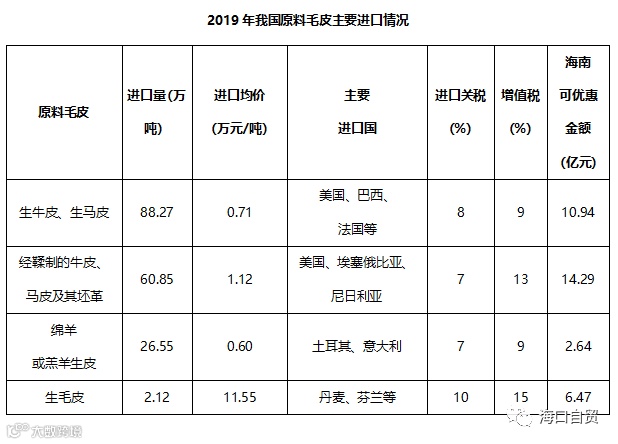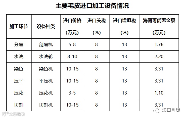 以国内某知名毛皮进口加工企业在海南省设立生产分公司,并基于在内地设立公司进行简单对比分析。目前内地生产企业,主要从皮具加工及销售,年进口牛皮3万吨,拥有5条生产线,生产线价格约为2000万元,以从美国进口牛皮,经营期1年为例进行比较: