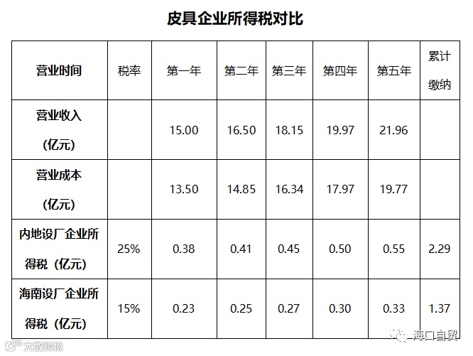 综上简单分析,通过对目前我国皮具行业头部企业生产经营状况的综合评估,结合海南自由贸易港企业所得税政策给予的企业所得税优惠可知,以皮具加工企业经营发展五年为基数,相较内地成立公司,在海南自由贸易港成立公司可累计节省约0.92亿元。