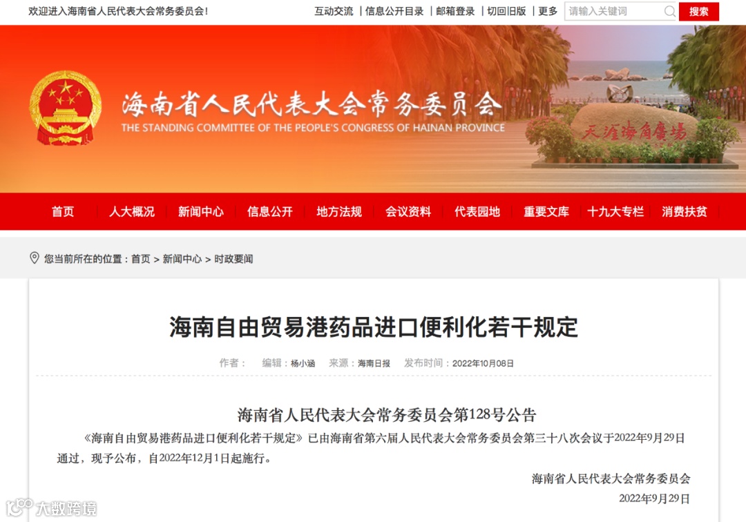 2022年9月29日,海南省六届人大常委会第三十八次会议审议通过了《海南自由贸易港药品进口便利化若干规定》(以下简称《若干规定》),共八条,自2022年12月1日起施行。