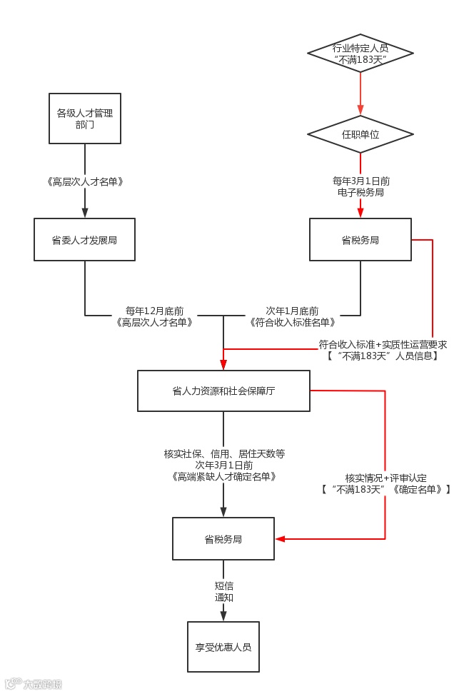 对满足“累计居住满183天”条件人员名单,省人力资 源和社会保障厅于次年3月1日前,向省税务局提供享受个人所得税优惠政策的高端紧缺人才确定名单。