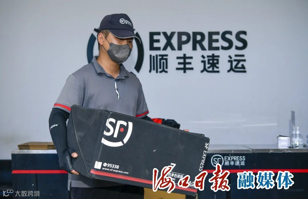 在海南顺丰速运有限公司汇水湾营业点,快递工作人员将共享包装箱装车。