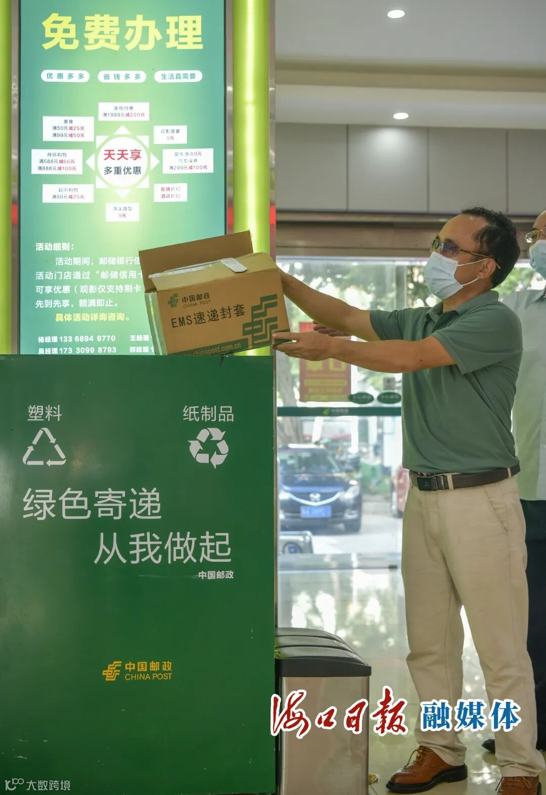 在海府路邮政网点,一进门便能看到一个绿色的废弃物回收箱,里面放着市民拆开包裹后需要丢弃的纸箱。回收箱旁边的桌子上,规格不一的绿色包装盒同样引人注目。