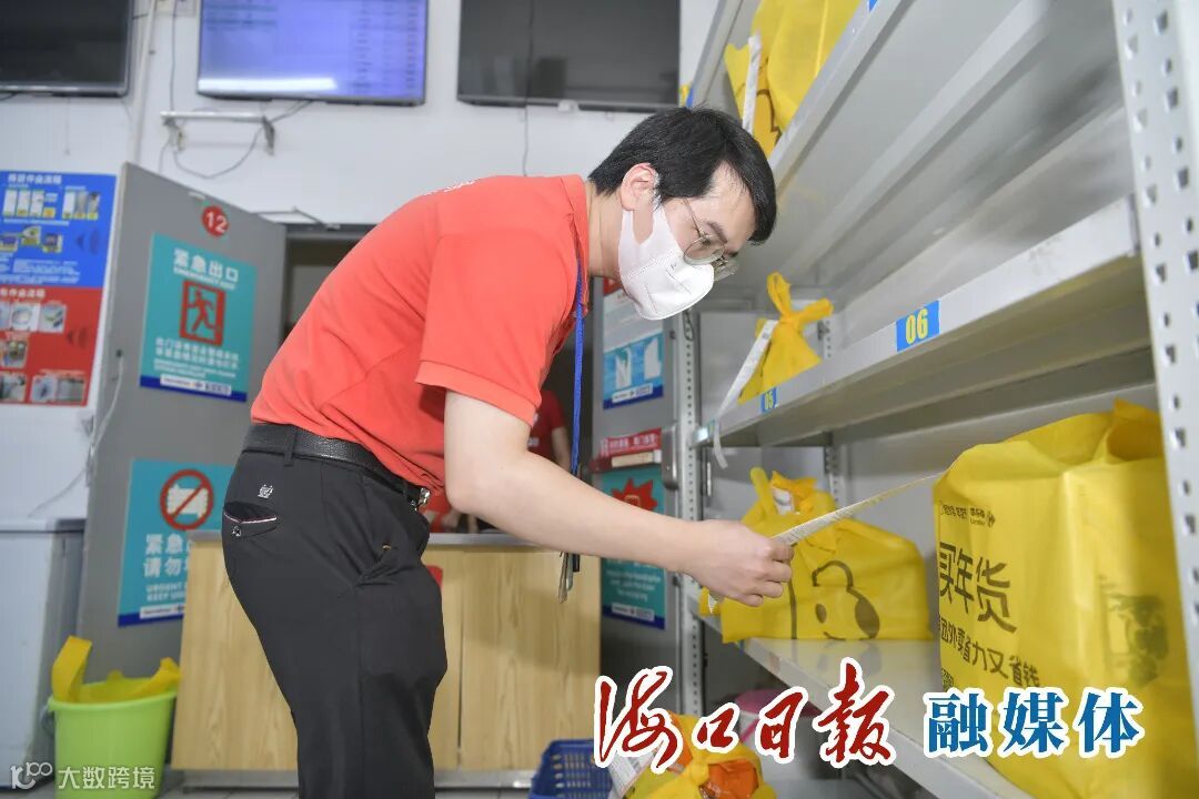 11月13日,在海口家乐福红城湖店,工作人员将消费者线上下单的商品打包好摆上置物架。