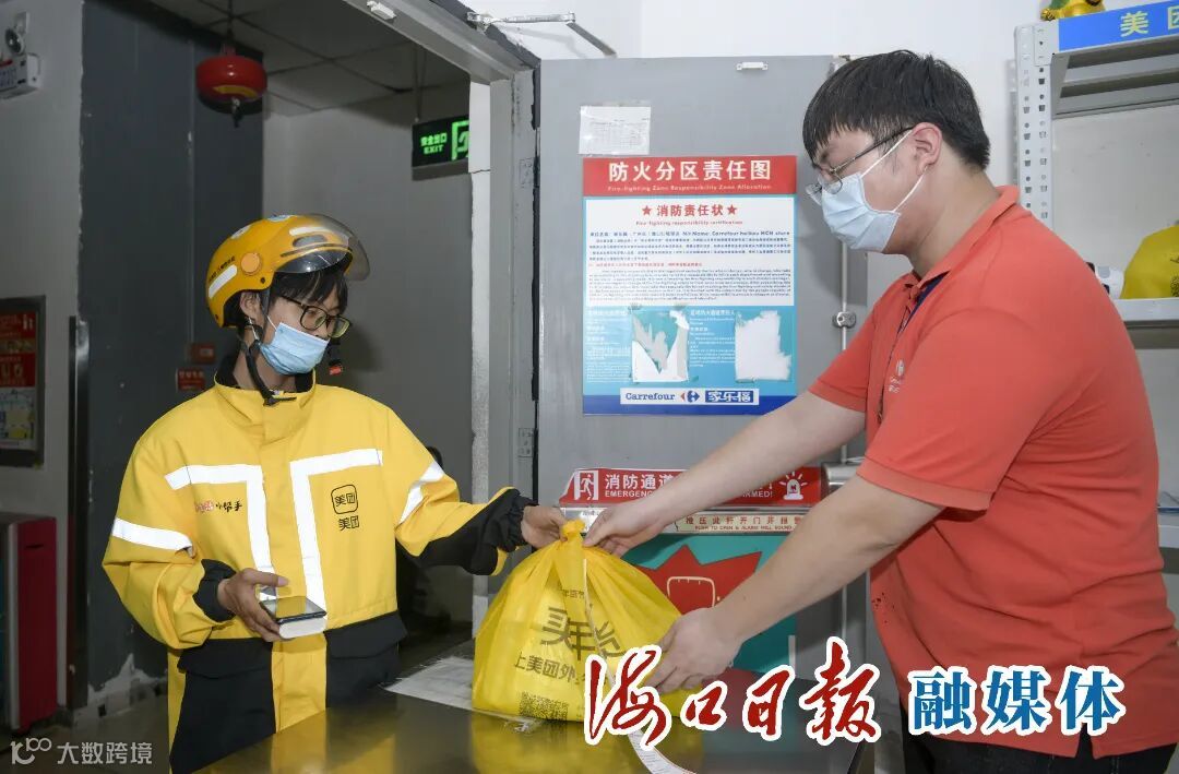 在海口家乐福红城湖店,工作人员将消费者线上下单的商品交给外卖骑手。