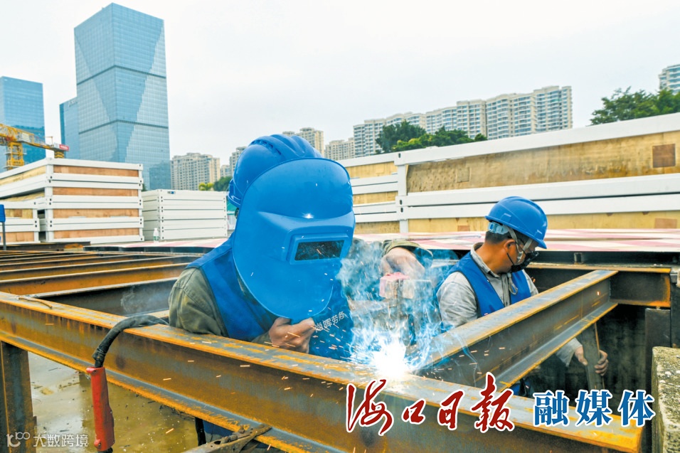 工人正在海南中心项目现场进行焊机施工。