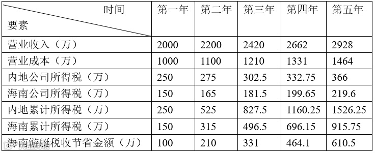 以海南与内地游艇公司缴纳5年企业所得税为例,假如海南省某游艇企业丙第一年营业收入为2000万,营业成本1000万。受益于海南自贸港游艇旅游多项利好政策的影响,游艇市场日益发展,该游艇企业营业收入与成本以10%的速率增长。如表1测算所示,以5年为发展基数,落户海南的游艇企业较之于内地可以节省缴纳610.5万元的企业所得税。