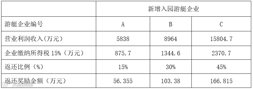 以三亚新增入园的游艇产业链企业为例,基于海南三亚游艇行业统计状况,假定游艇企业对三亚地方财力贡献主要体现在企业所得税,公司A、公司B、公司C的年度营业利润分别为5838、8964、15804.7(涉及三种不同奖补比例情况)。如表2可以发现,公司A、公司B、公司C分别按照15%、30%、45%的三种奖补退还比例测算,可以分别退还56.355、103.38、166.815万元。这项奖励退还的利好政策一定程度上可缓解游艇企业的资金压力,助力游艇产业提质升级,还有利于进一步加快三亚中央商务区游艇产业发展,促进产业聚集,提升三亚游艇旅游品质和国际化水平。