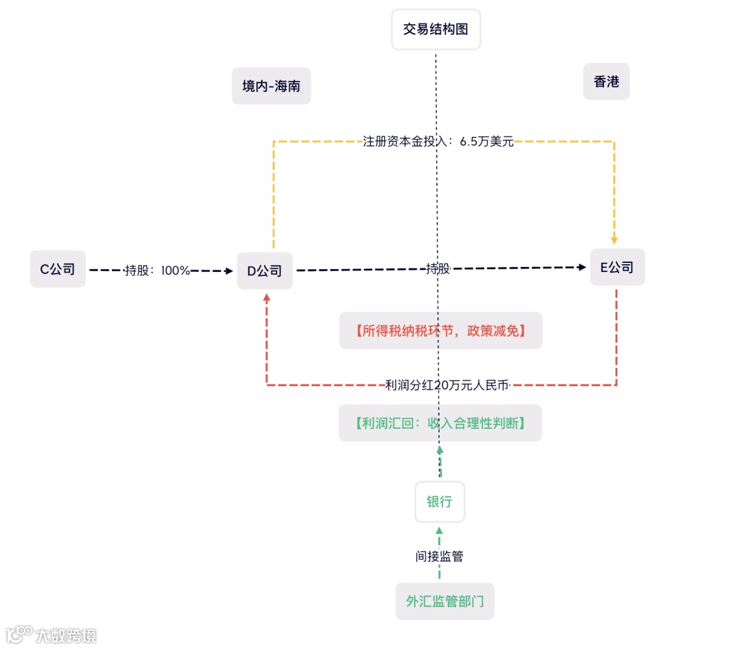 2021年5月,D公司通过省发改委和省商务厅备案,在香港注册成立境外子公司(以下简称E公司),投资6.5万美元,主要经营范围为医疗用品及器械的国际贸易、市场推广及产品相关的商业咨询,并于2022年收到E公司利润分红20万人民币。