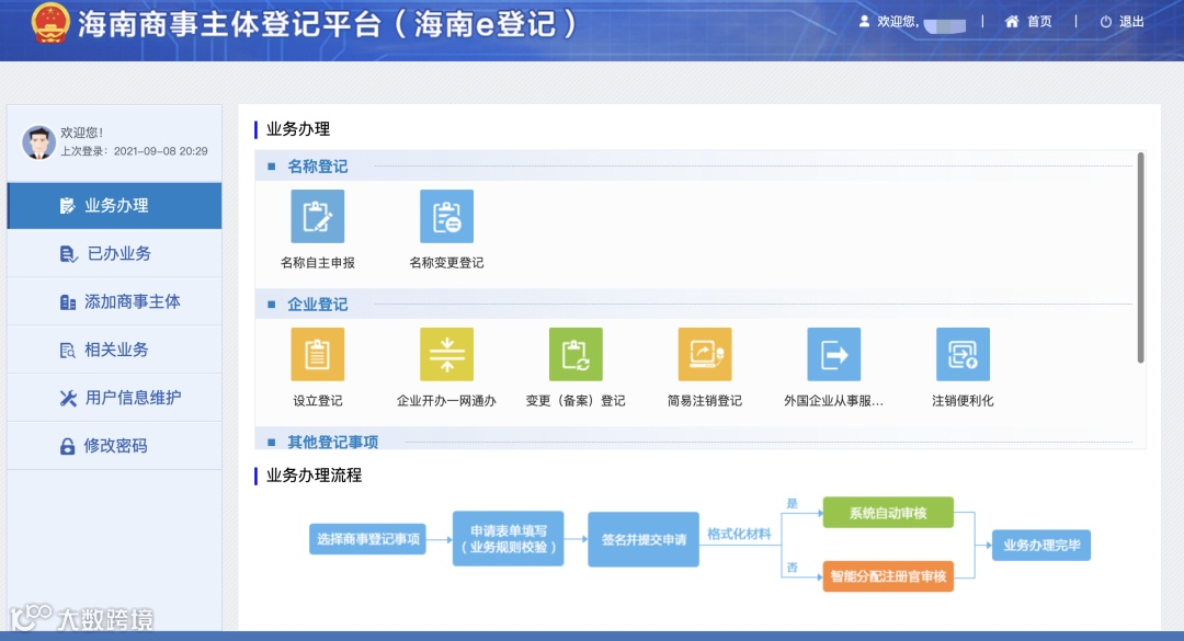 海南全面推行企业开办全程网上办,在海南商事主体登记平台(海南e登记)上可办理名称申报、注册登记、印章刻制、申领普通发票、社保登记等各类企业开办事项。