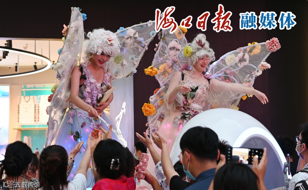 10月28日上午,cdf海口国际免税城开业当天,现场表演的“花仙子”正与市民游客互动。海口日报融媒体记者 张俊其 摄