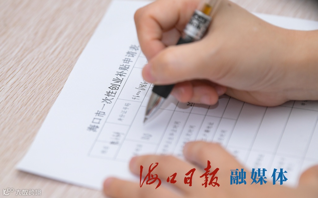 创业者在海口市创业小额贷款担保中心服务大厅填写一次性创业补贴申请表。