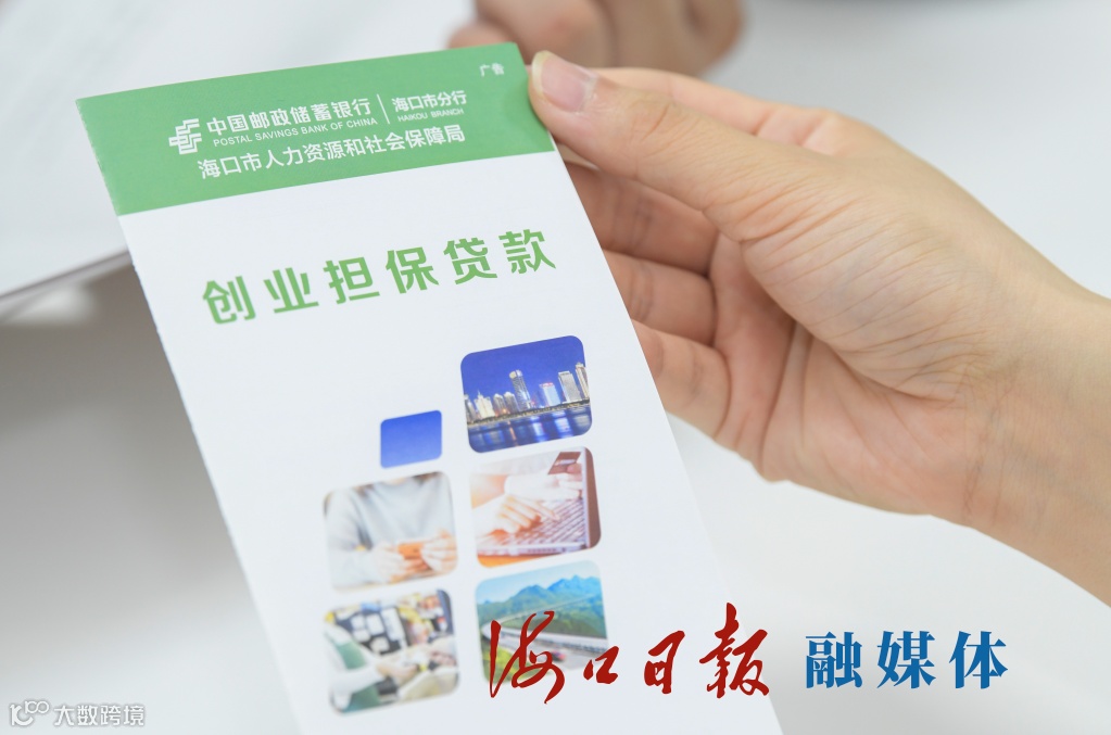 市民在中国邮政储蓄银行海口市分行观看创业担保贷款宣传册。