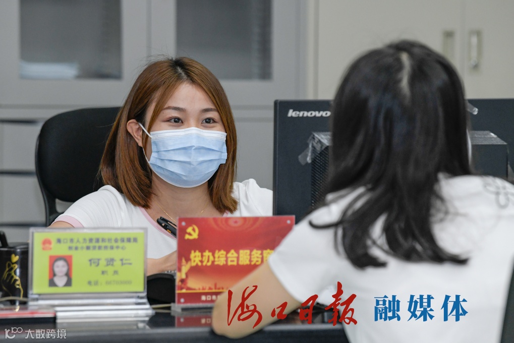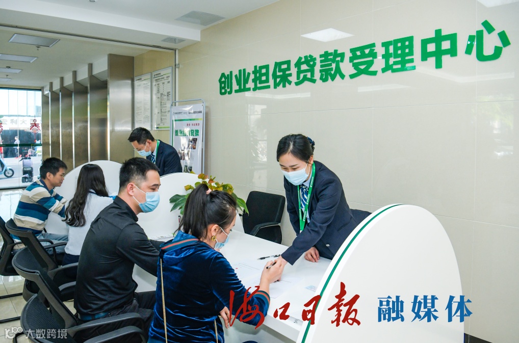 海口市创业小额贷款担保中心服务大厅,市民正在申请创业补贴。