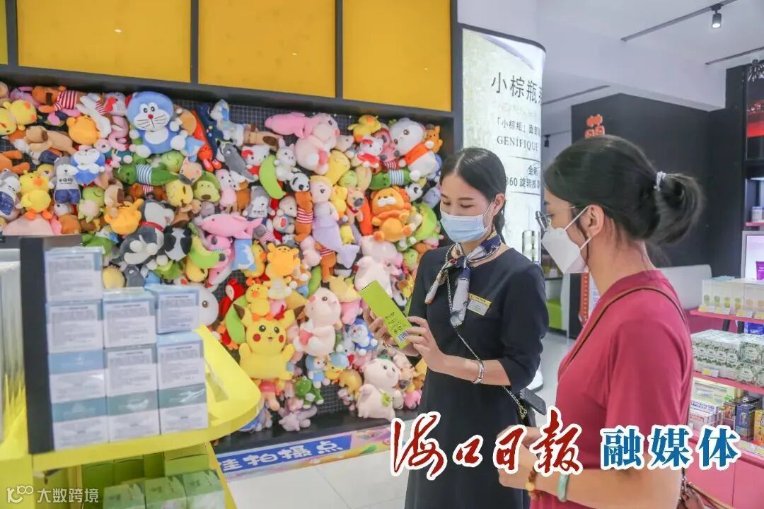 8月31日,在友谊·南海城椰岛全球购门店,工作人员向顾客介绍跨境电商商品。海口日报融媒体见习记者 孙士杰 摄