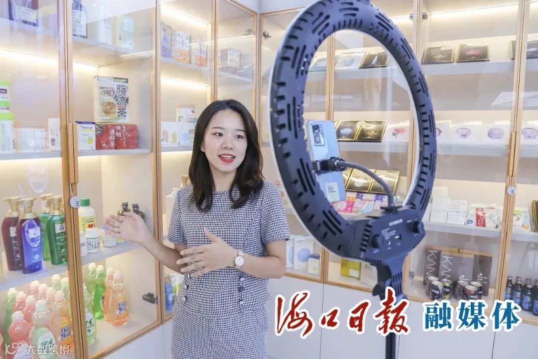 8月31日,在海口关免全球购跨境电商直播基地,主播通过直播向观众介绍跨境电商商品。海口日报融媒体见习记者 孙士杰 摄