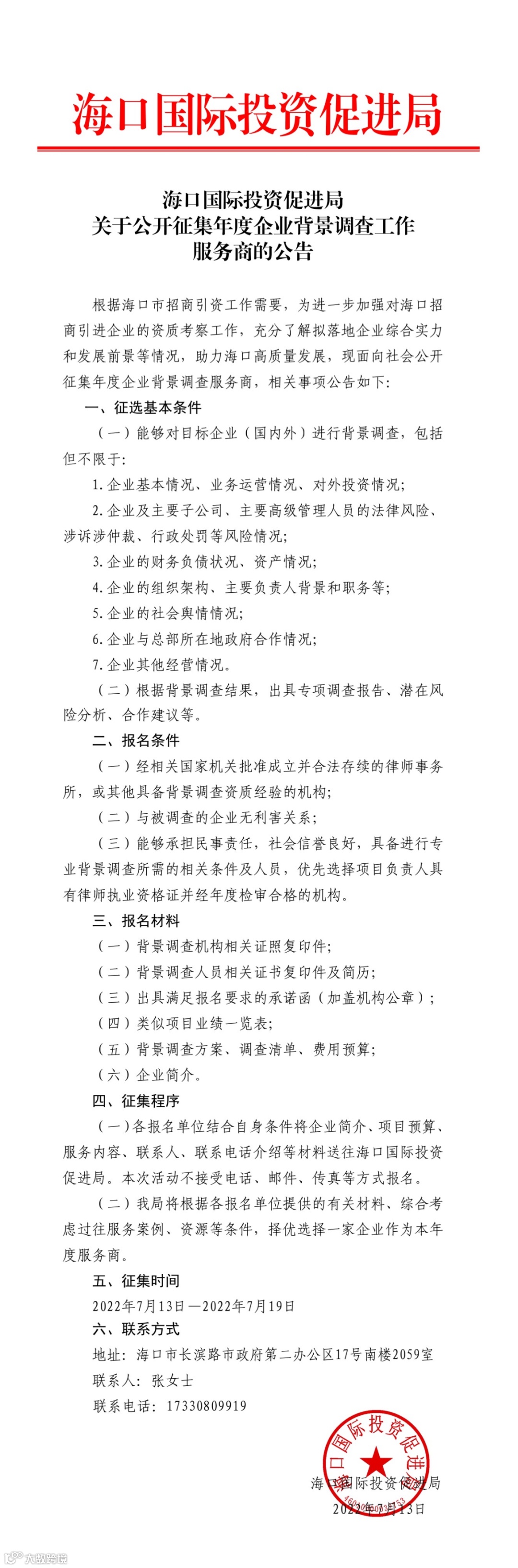 海口国际投资促进局关于公开征集年度企业背景调查工作服务商的公告