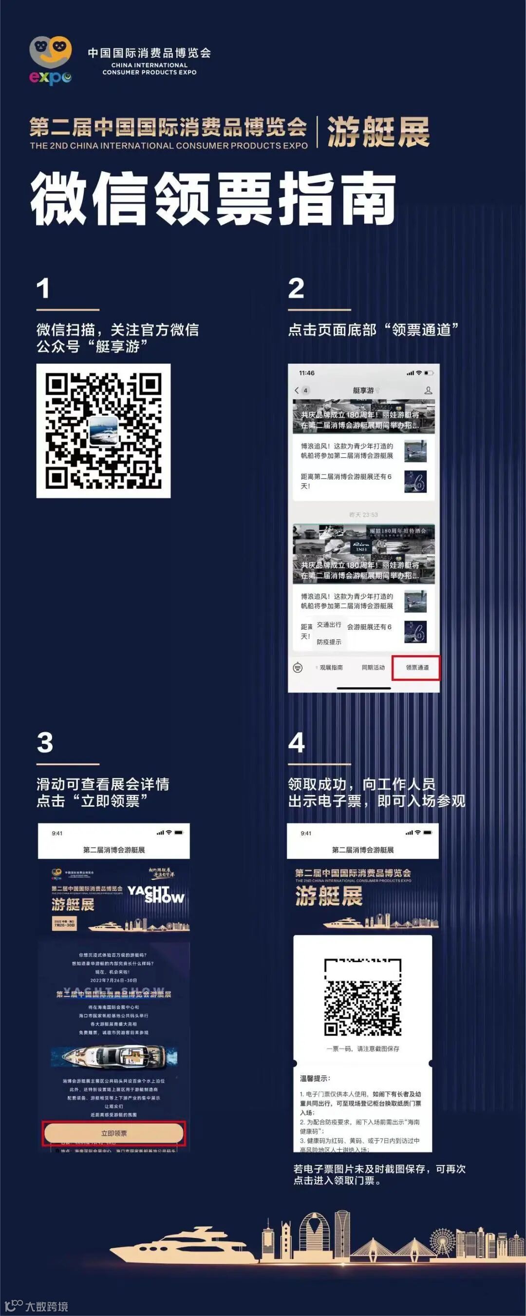 第二届消博会游艇展还设有意大利、美国、德国、荷兰四个主题馆,旨在进一步展示海南、海口游艇产业招商成果和游艇旅游产品。展会期间,主办方还为参展商和观众量身打造了丰富的现场活动,包括游艇展启航仪式、品牌游艇首发首秀、品牌游艇对接会、国际游艇论坛、海口时尚生活节等。市民游客可通过关注“艇享游”微信公众号免费领取门票。