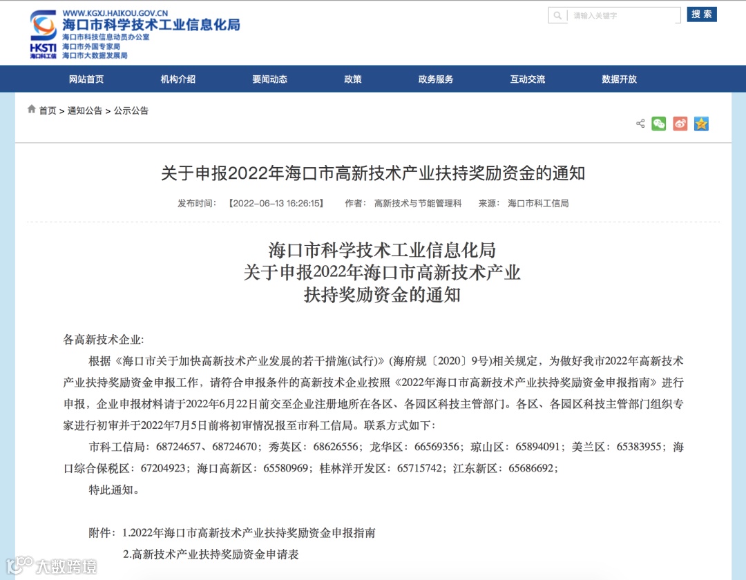 6月13日,海口市科工信局下发通知,启动2022年海口市高新技术产业扶持奖励资金申报。5类高新技术企业及机构可自愿申报,其中首次通过认定的高新技术企业一次性可获50万元奖励。企业申报日期截至6月22日。