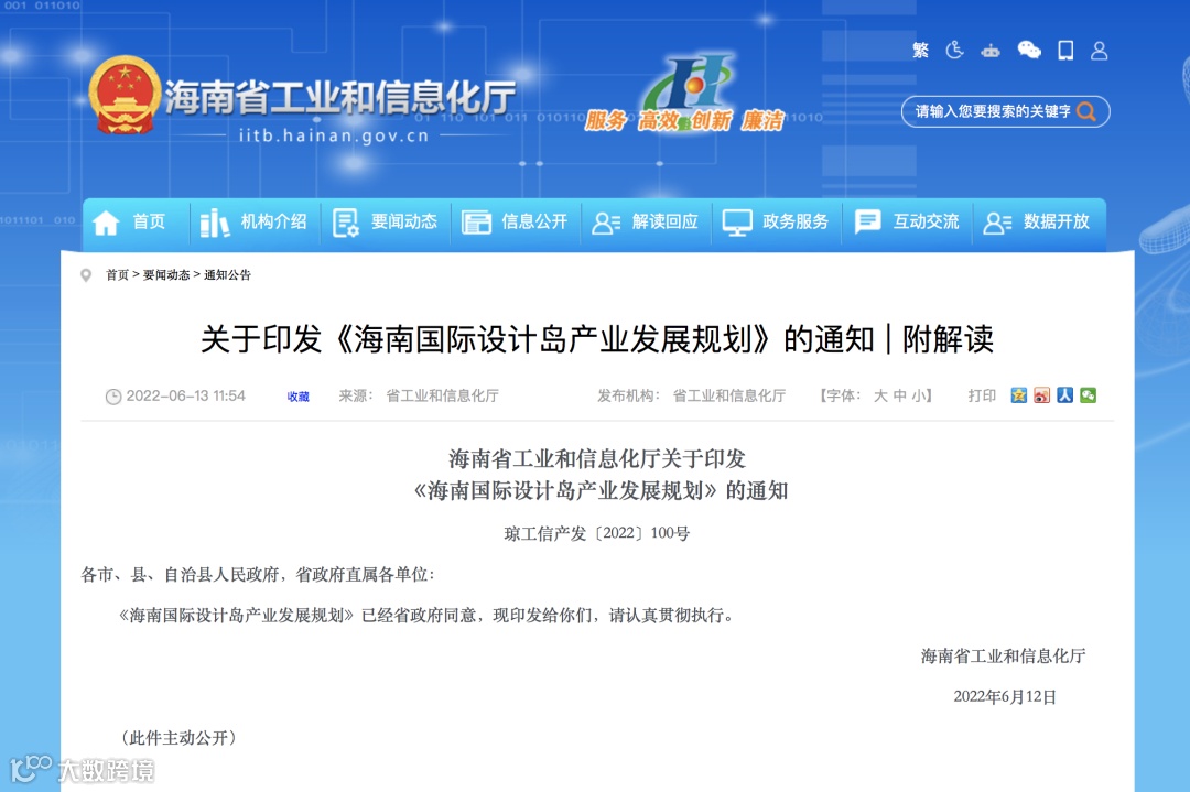 2021年10月18日,海南省工业和信息化厅出台《海南国际设计岛示范基地管理办法(试行)》,明确海南国际设计岛示范基地认定范围参考国家对设计产业的学科分类,按运营类设计产业示范基地和文化传承类设计示范基地授牌匾和证书。