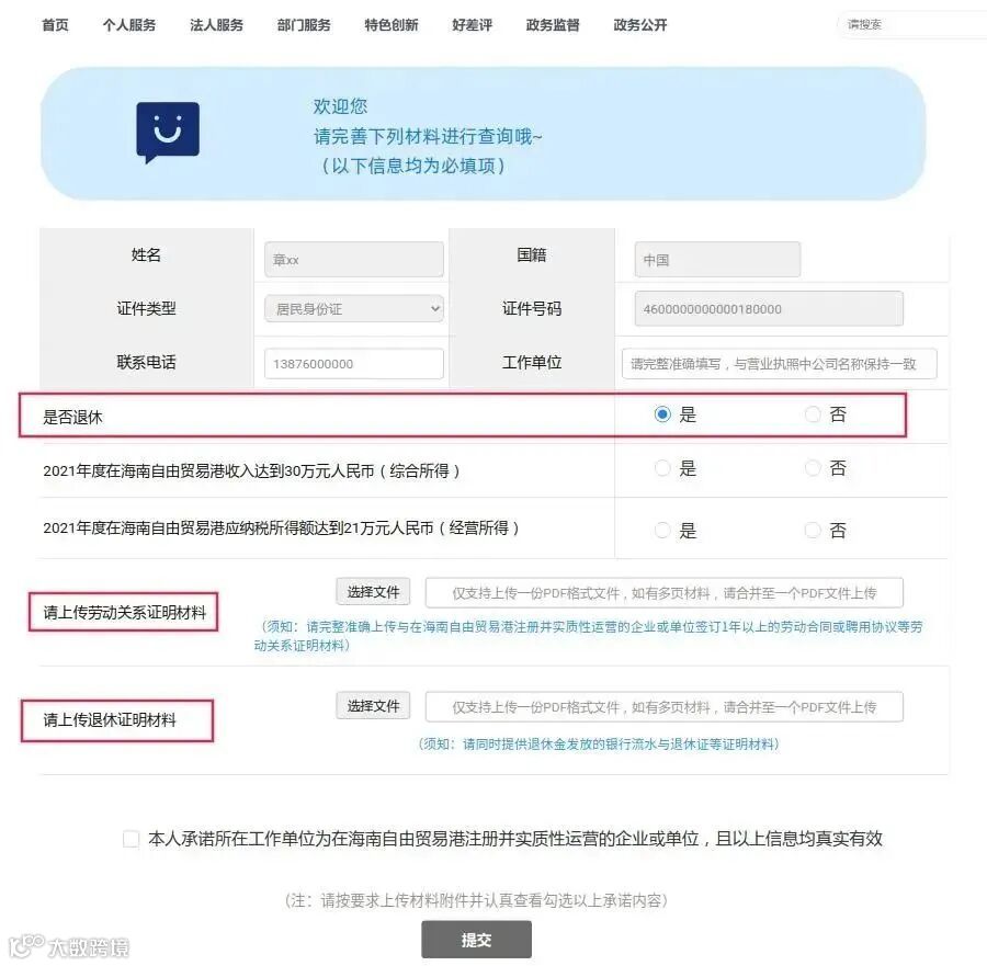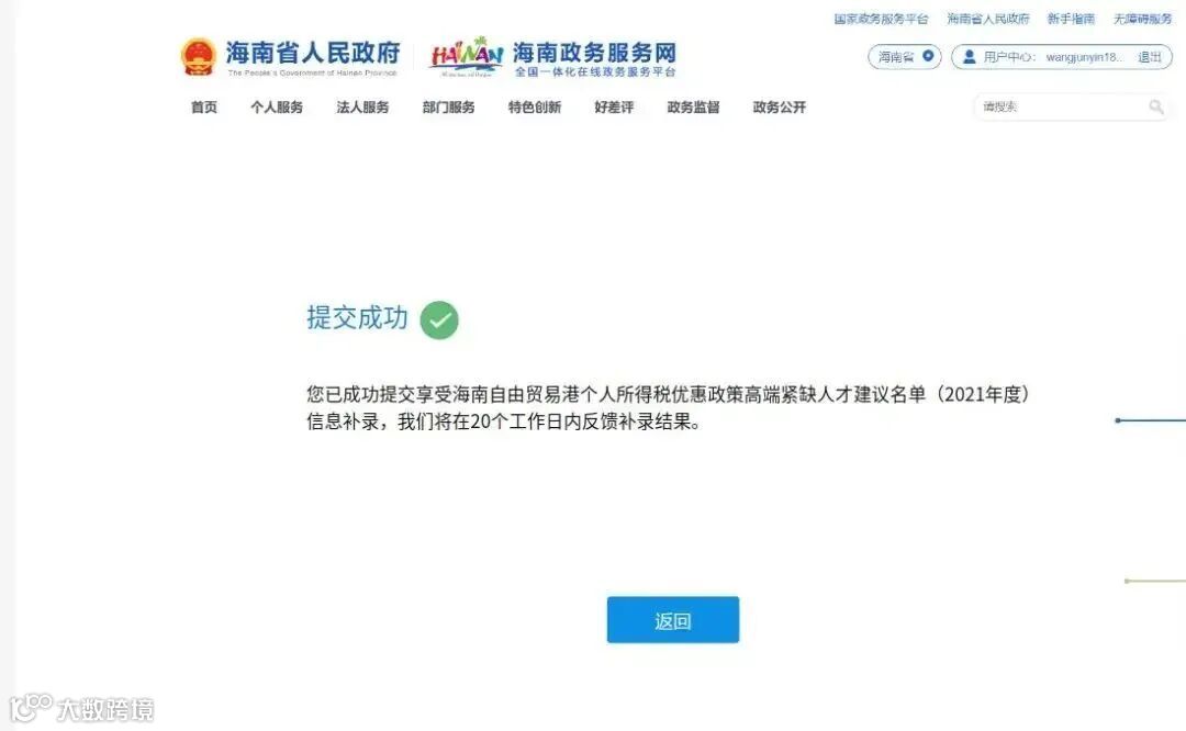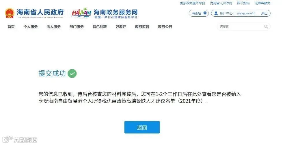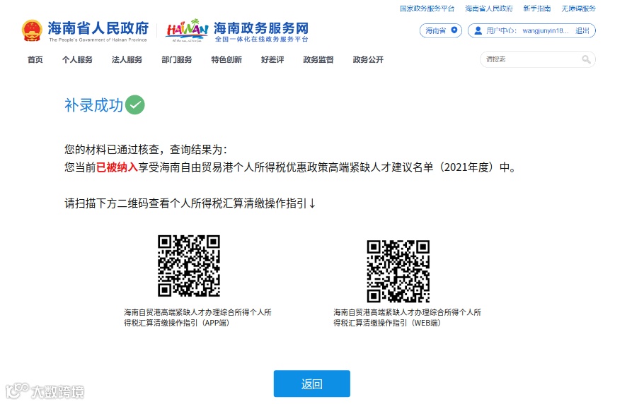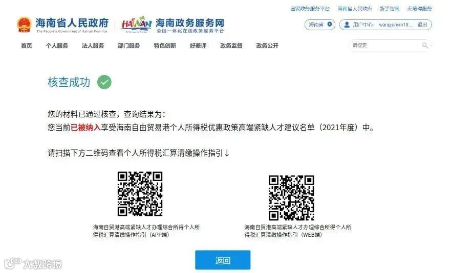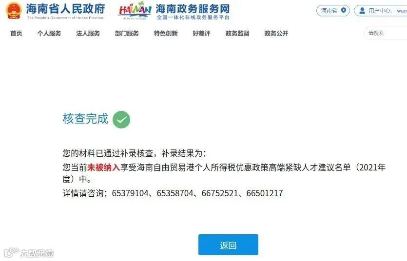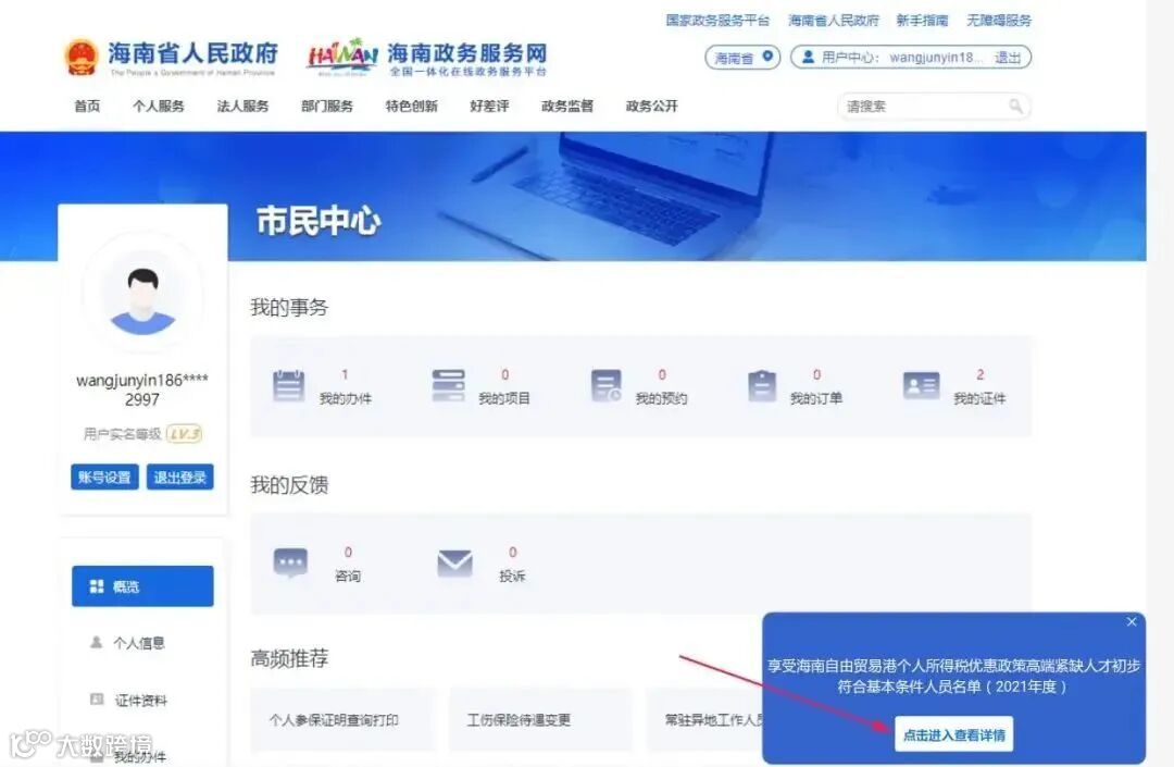 点击用户中心右下角弹窗中的“点击进入查看详情”,可查看自己是否在享受海南自由贸易港个人所得税优惠政策高端紧缺人才初步符合基本条件人员名单范围内。