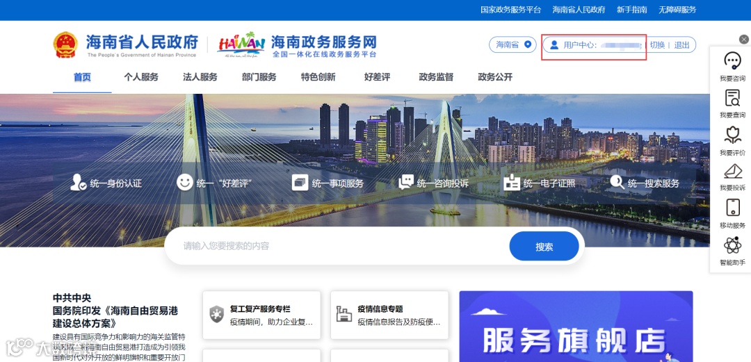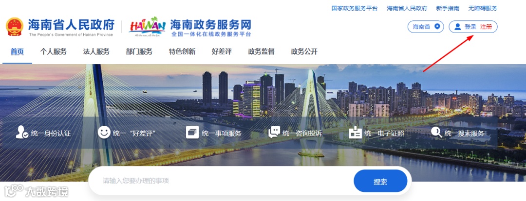 https://wssp.hainan.gov.cn/hnwt/home,点击页面右上角“登录/注册”,根据系统提示进行登录/注册。