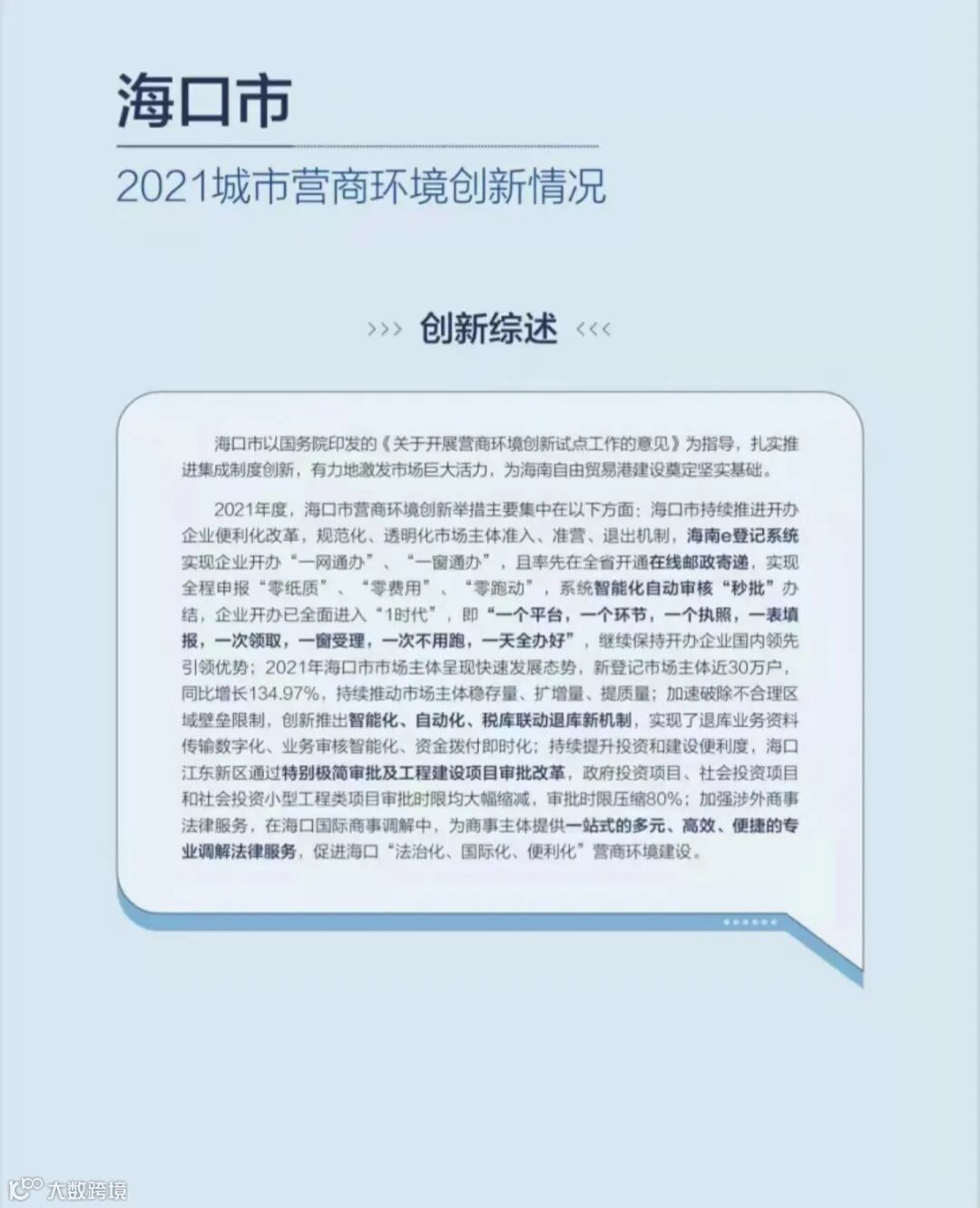 海口市以国务院印发的《关于开展营商环境创新试点工作的意见》(下称《意见》)为指导,扎实推进集成制度创新,有力地激发市场巨大活力,为海南自由贸易港建设奠定坚实基础。