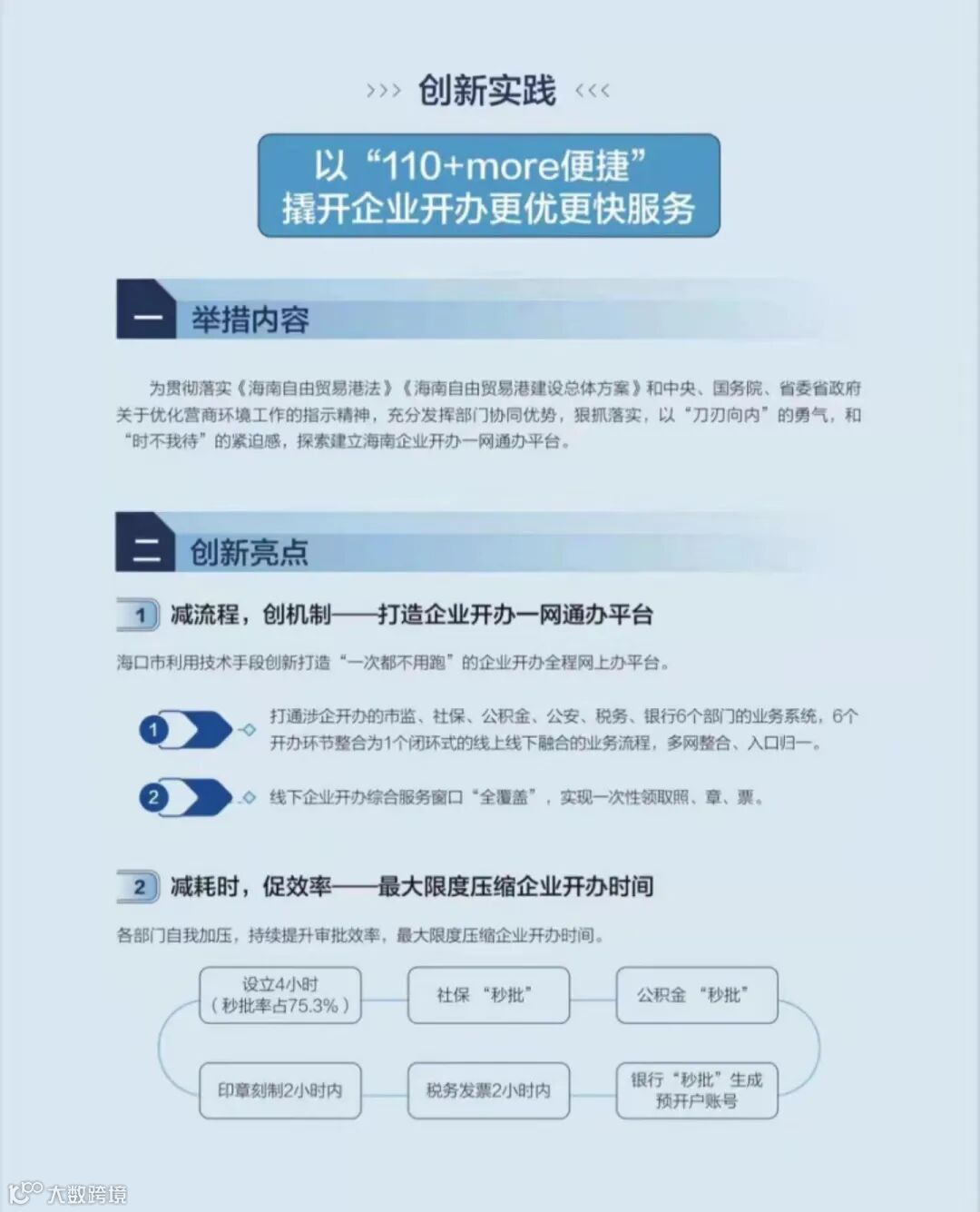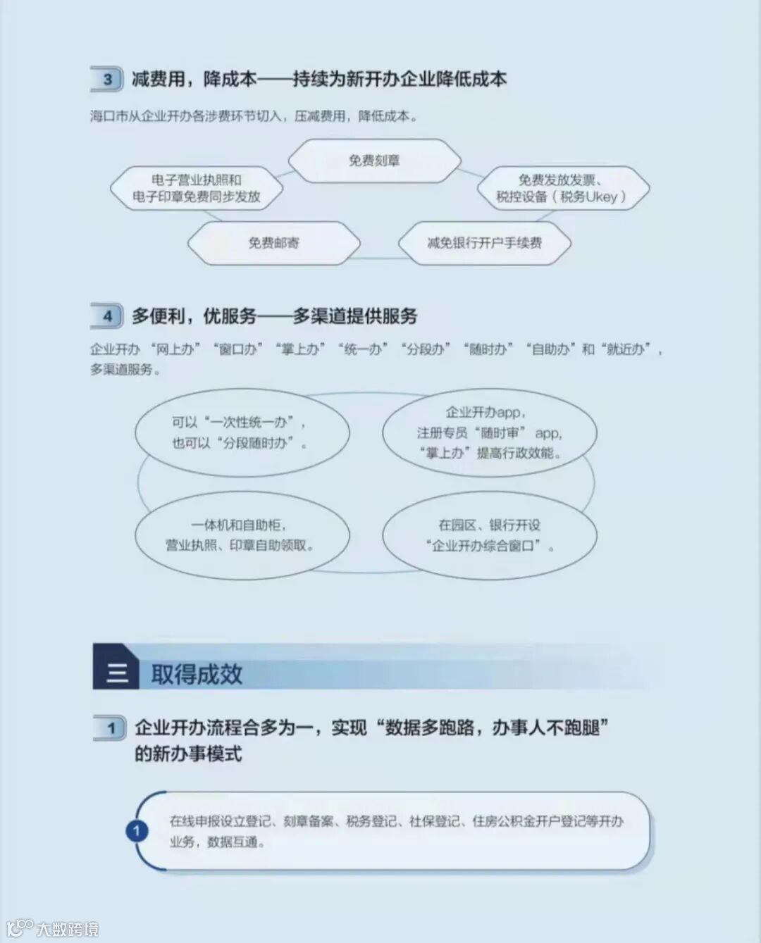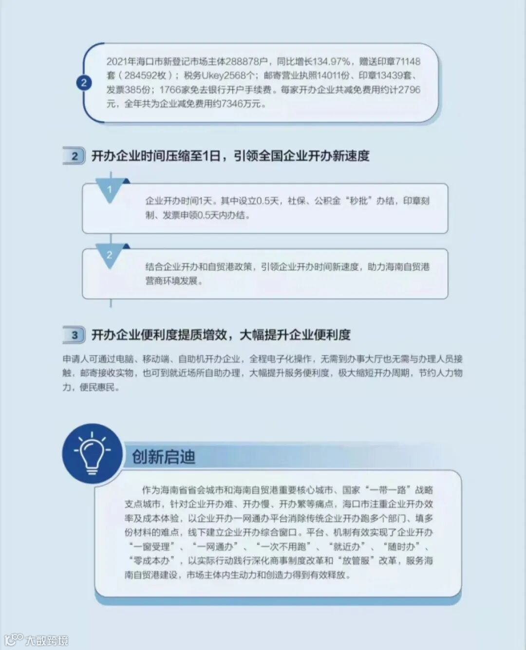 海口市持续推进开办企业便利化改革,规范化、透明化市场主体准入、准营、退出机制,海南e登记系统实现企业开办“一网通办”“一窗通办”,且率先在全省开通在线邮政寄递,实现全程申报“零纸质”“零费用”“零跑动”,系统智能化自动审核“秒批”办结,企业开办已全面进入“1时代”,即“一个平台,一个环节,一个执照,一表填报,一次领取,一窗受理,一次不用跑,一天全办好”,继续保持开办企业国内领先引领优势。