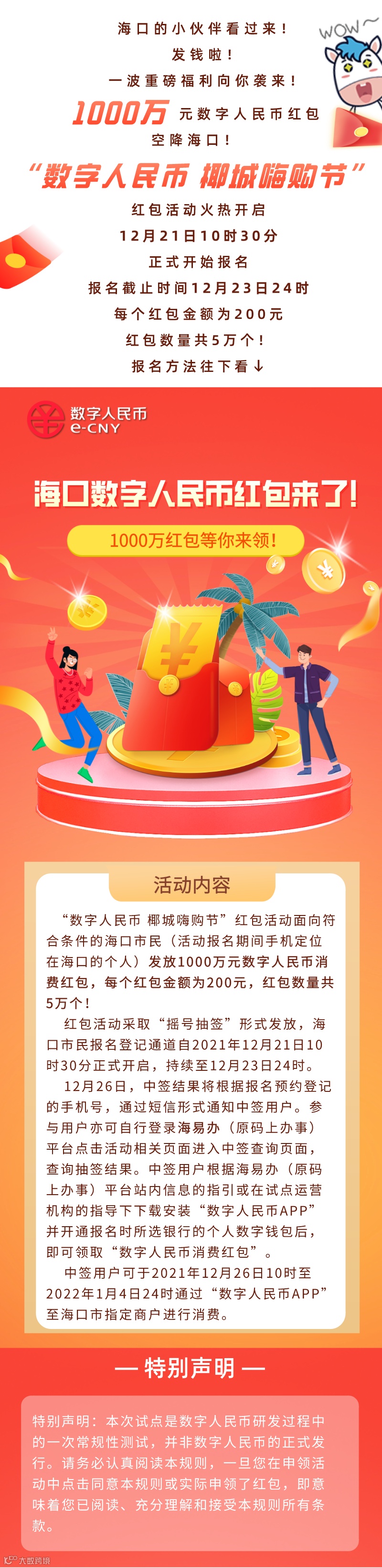 本次活动面向海口市民(活动报名期间手机定位在海口的个人),通过抽签发放数字人民币红包。数字人民币红包共5万个,每个红包金额为200元,总计发放金额为1000万元。中签市民可以使用数字人民币红包在海口市指定商户进行消费。